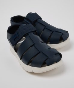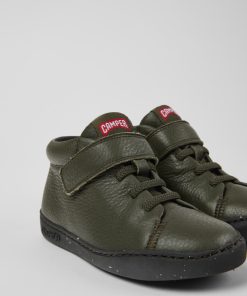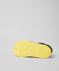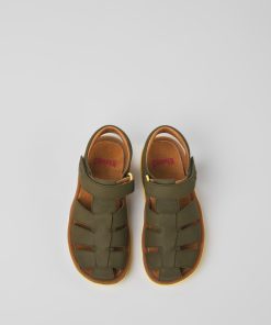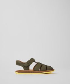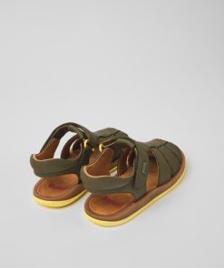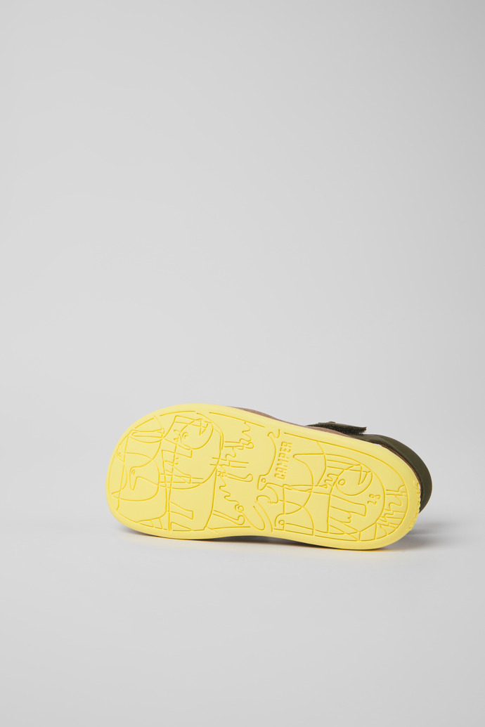 Sandalias verdes de piel para niños con sistema de autocierre y suelas de goma (20% recicladas).Nuestra sandalia Bicho es ajustable y sus plantillas ergonómicas hechas de goma y cáscara de arroz recicladas se adaptan al pie.
