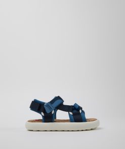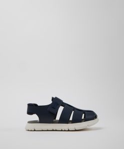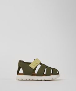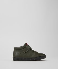 Sandalias verdes de piel para niños con sistema de autocierre y suelas de goma (20% recicladas).Nuestra sandalia Bicho es ajustable y sus plantillas ergonómicas hechas de goma y cáscara de arroz recicladas se adaptan al pie.