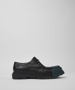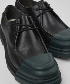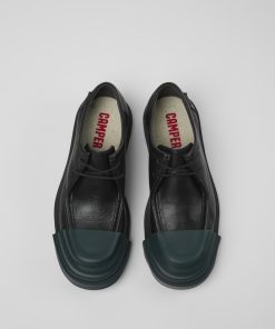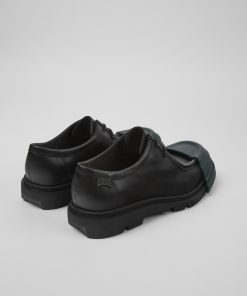 Zapatos para mujer en piel negra con punteras extraíbles, plantillas extraíbles OrthoLite® Recycled™ y suelas de goma (40% natural, 23% reciclada).Fabricado con los mínimos componentes y pegamento posibles, Junction es fácil de desmontar, lo que promueve un enfoque más circular en la fabricación de calzado.