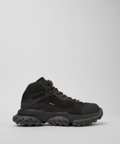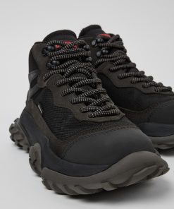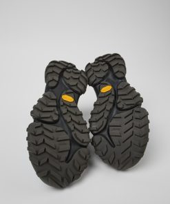 Botines negros y grises para mujer en tejido de poliéster reciclado y nobuk con membranas GORE-TEX ePE, Plantillas OrthoLite® Recycled™, entresuela ReXarge y Suelas Vibram Ecostep (30% recicladas).Un diseño ergonómico y unisex inspirado en el paisaje rocoso de la sierra de Tramuntana. Así es Karst.