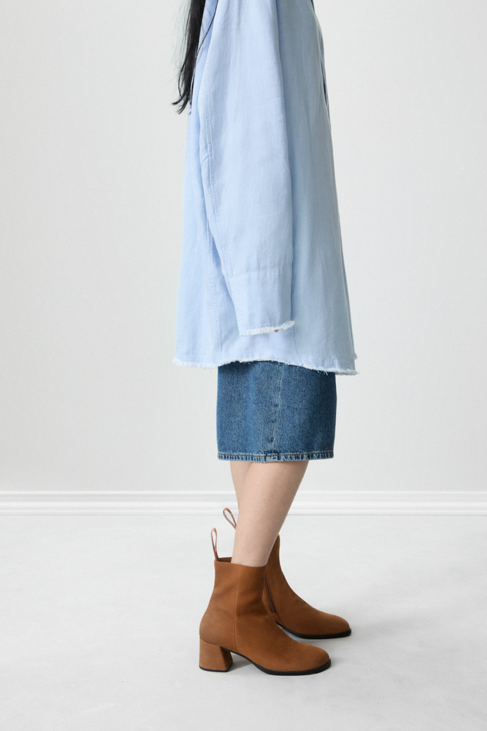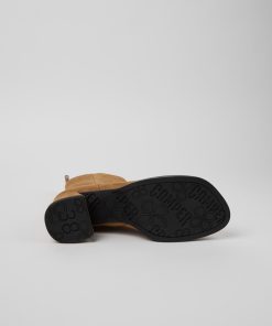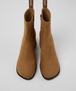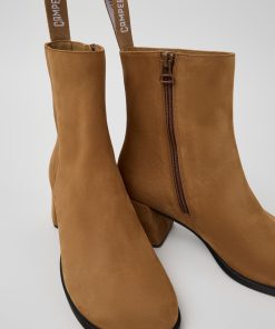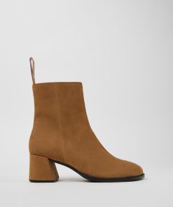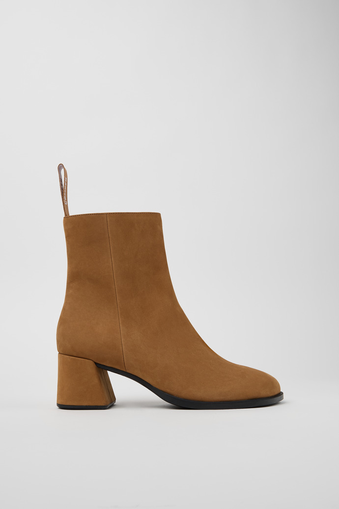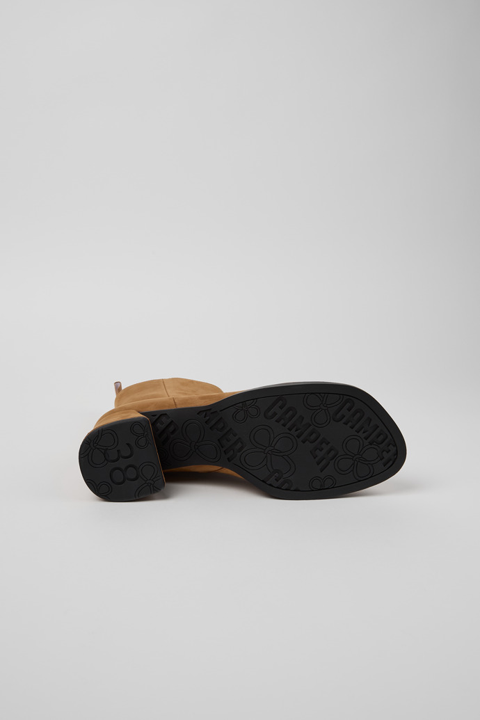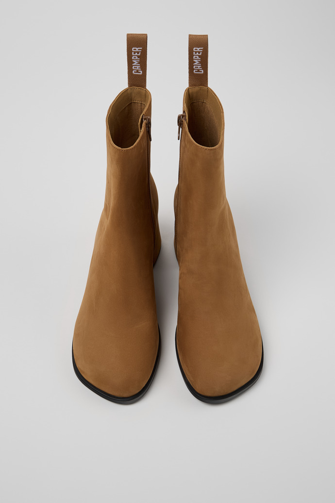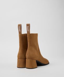Botas de media caña marrones para mujer en nobuk con plantillas recicladas OrthoLite® y suelas de goma y ABS.Kora es un tacón bajo de verano versátil y femenino, diseñado para el día a día, con empeines extremadamente suaves y una plantilla acolchada Ortholite® para mayor comodidad.