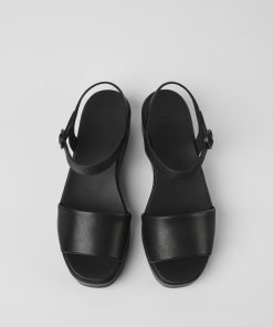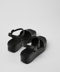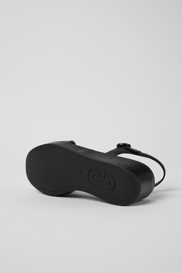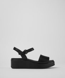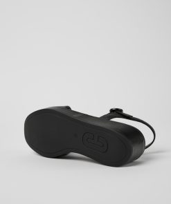 Sandalia negra en piel flor para mujer con suela gruesa de caucho.Nuestra sandalia para mujer Misia ofrece gran estabilidad ya que se apoya sobre una plataforma acolchada forrada en elegante piel monocolor.