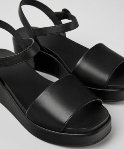 Sandalia negra en piel flor para mujer con suela gruesa de caucho.Nuestra sandalia para mujer Misia ofrece gran estabilidad ya que se apoya sobre una plataforma acolchada forrada en elegante piel monocolor.