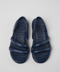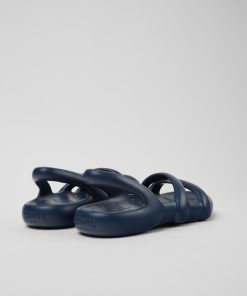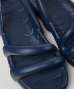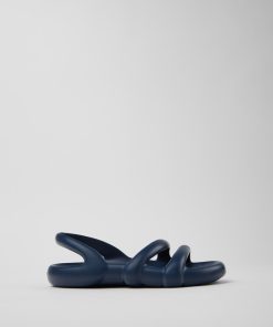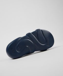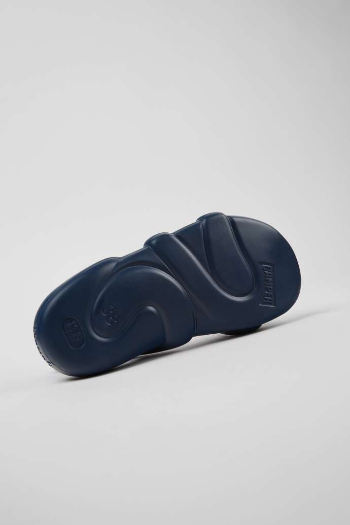 Sandalía azul con XL EXTRALIGHT® OrganixTM 3.0. (30% de componentes biocirculares).La versión plana del tacón Kobarah también está fabricada con materiales totalmente reciclables y conserva el volumen, la curvatura y su movimiento infinito.