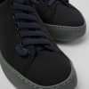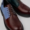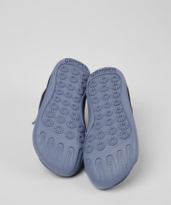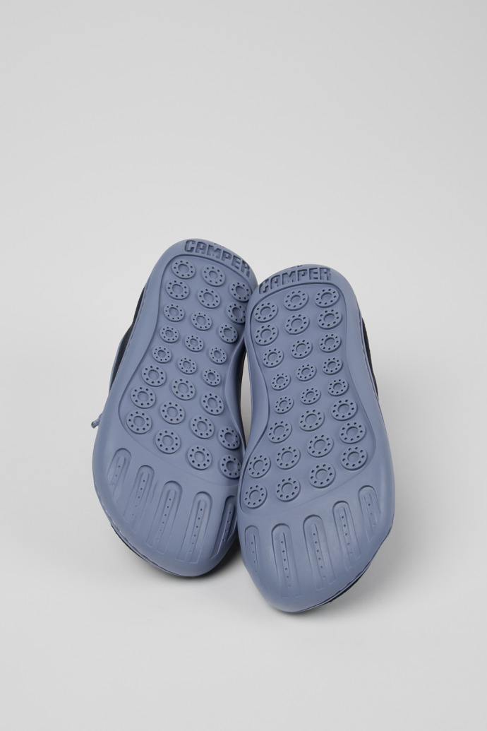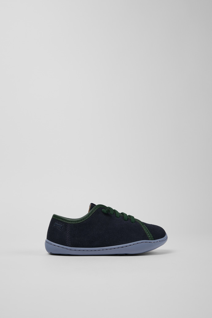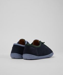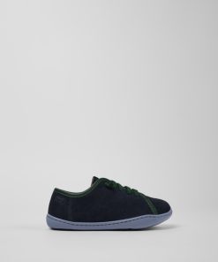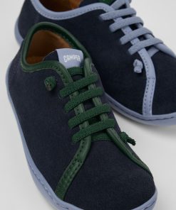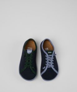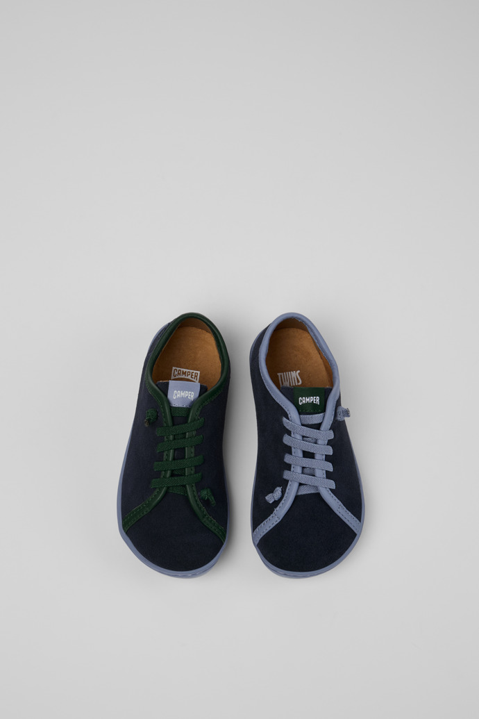 Zapatos azules y verdes para niños de piel y nobuk con plantilla de EVA, cordones elásticos y suelas de goma.Nacido en 1988, nuestro concepto clásico TWINS, – opuestos pero complementarios – , desafía la idea de que los zapatos deben ser idénticos y sigue vivo en estos zapatos para niños que no hacen juego, pero forman una pareja realmente única.