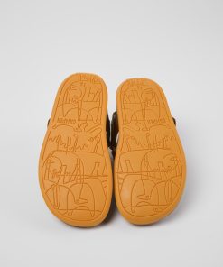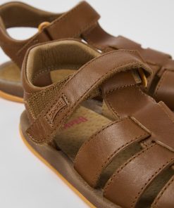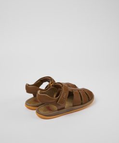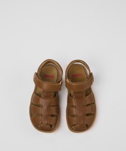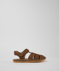 Sandalias de piel marrones para niños, con sistema de autocierre y suelas de goma.Nuestra sandalia Bicho es ajustable y sus plantillas ergonómicas hechas de goma y cáscaras de arroz recicladas se adaptan al pie.