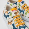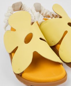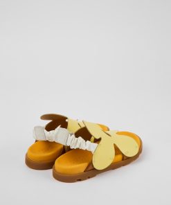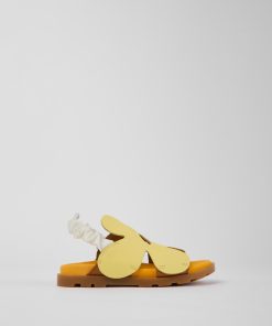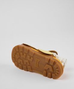 Sandalias amarillas y marrones de piel y tejido para niños con un recorte de flor extragrande, plantillas no extraíbles OrthoLite® Recycled™ y suelas de goma.El modelo Brutus para niños, con su robusto diseño urbano y su agarre excepcional es duradero gracias a la costura 360º.