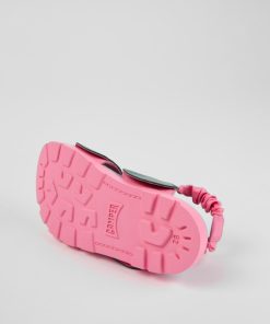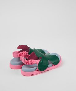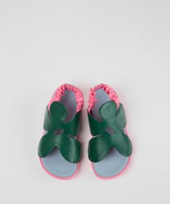 Sandalias verdes y rosas de piel y tejido para niños con un recorte de flor extragrande, plantillas no extraíbles OrthoLite® Recycled™ y suelas de goma.El modelo Brutus para niños, con su robusto diseño urbano y su agarre excepcional es duradero gracias a la costura 360º.
