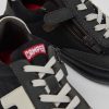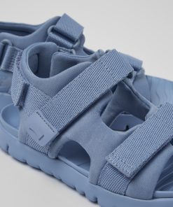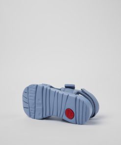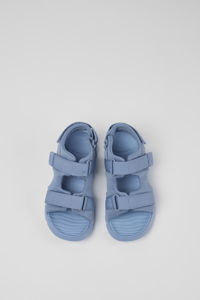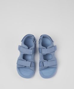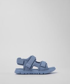 Sandalias de tejido azules con dos tiras para niños, con neopreno de PET reciclado diseñado para el agua, sistema de autocierre, plantillas de EVA acolchadas y suelas 100% EVA.Oruga es un modelo ligero y flexible que combina el característico estilo urbano de Camper con suaves pieles y tejidos.