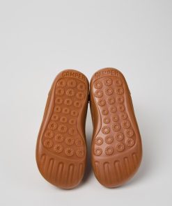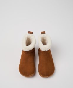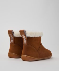 Botines marrones para niños de nobuk con suelas de goma.Un icono de Camper que evoluciona cada temporada. Peu es simplicidad funcional inspirada en la acción de caminar descalzo. Cosido en 360º y construido con la técnica Strobel, garantiza flexibilidad y durabilidad inigualables en cualquier situación.