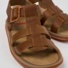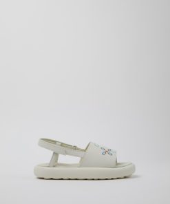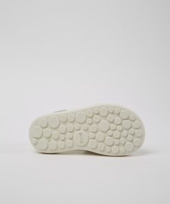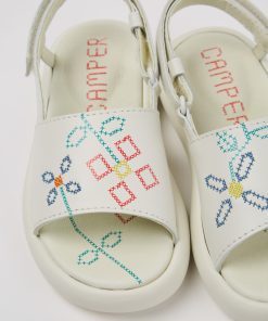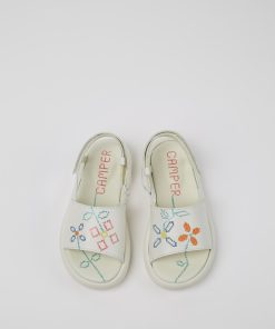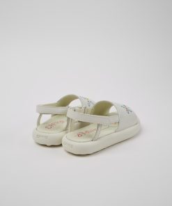 Sandalias en piel blanca para niños con sistema de autocierre, plantilla de EVA y suelas de EVA.Nacido en 1988, nuestro concepto clásico TWINS, opuestos pero complementarios, desafía la idea de que los zapatos deben ser idénticos y sigue vivo en estos zapatos para niños que no hacen juego, pero forman una pareja realmente única.