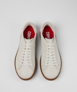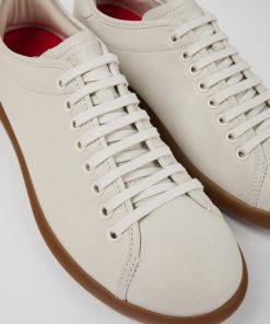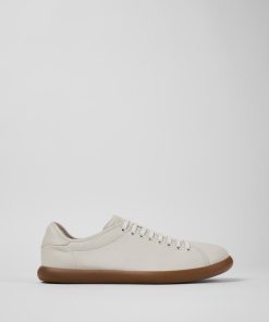 Sneaker para hombre en piel blanca con plantilla OrthoLite® Recycled™ y suelas de goma.Su nombre está inspirado en un pequeño pueblo de Mallorca, Pelotas Soller es una sneaker veraniega, honesta y sin pretensiones, elaborada con mínimos componentes.