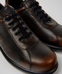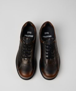 Zapatos para hombre en piel negro-marrón con plantillas de PU y suelas de goma.Fabricados en EuropaNos dedicamos a crear productos duraderos y de larga duración con el menor impacto ambiental posible. Desarrollados y fabricados en Europa, cada par combina materiales de la más alta calidad con generaciones de tradición zapatera.Pelotas Ariel es el modelo más icónico de Camper. Con su suela inconfundible, compuesta por 87 esferas e inspirada en el deporte, cada par está fabricado a mano con pieles europeas cosidas en 360º a la suela original de goma.